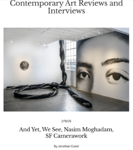 In May of 2010, Curiel became art critic for SF Weekly, where he wrote reviews of gallery and museum exhibits – as in his June 2021 review of a major Raymond Saunders retrospective, in which Curiel reminded readers that Sanders has never wanted his art labeled as “Black art,” and Curiel’s 2019 review of photographs that show Native American lives in the 1860s; conducted in-depth Q&As – as with writer Fran Lebowitz (interviewed about her friendship with photographer Peter Hujar), literary figure Lawrence Ferlinghetti, New Yorker cartoonist Mark Ulriksen, painter Chuck Close, painter Wayne Thiebaud, sculptor and painter Richard Serra, Alabama multi-media artist and singer Lonnie Holley, multi-media artist Lynn Hershman (see also here), and Palestinian visual artist Yazan Khalili; originated and wrote the first street-art column in traditional American media for which he also took photos that were published, and wrote cover stories about San Francisco street artists surviving the city’s gentrification (see also here), and about queer street art, which was the first major U.S. media profile of the genre (see also here); reported on non-art stories, such as an exclusive interview with choreographer Bill T. Jones about his touring Broadway play Fela! (see also here); wrote an essay on what some people call his resemblance to Howard Stern – an essay that explained Curiel’s hatred of Stern but also detailed the many contradictions of their resemblance, and a few bona fide similarities (the essay was republished on Medium in December 2020); and reported long-form stories about the political and activist group the Black Panthers and about Syrian refugees who found refuge in California (both long-form articles were cover stories) and about Teotihuacan, the ancient pyramid site, which he reported from the site on the outskirts of Mexico City. In 2026, Curiel returned to art reviewing with a review of Nasim Moghadam’s exhibit And Yet, We See — written for Roborant Review, a publication started by Hugh Leeman and Matt Gonzalez in 2025 to “offer a diversity of sources in contemporary long-form art writing.”